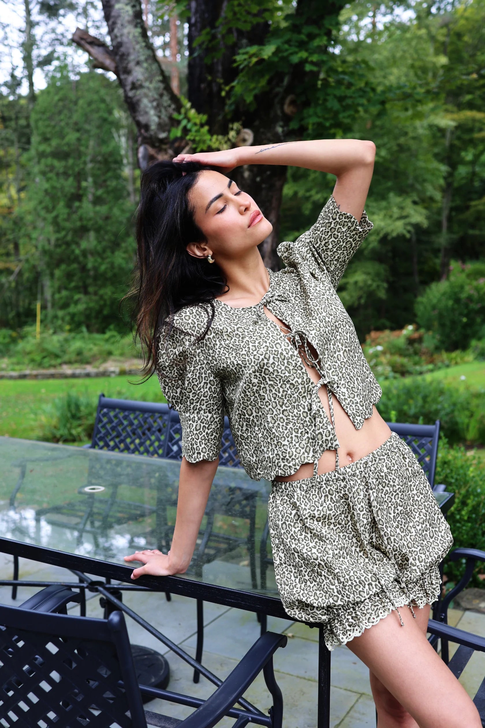 The Scalloped Top is a cropped blouse with a delicate and feminine design. Featuring short puffed sleeves and a scalloped hem. The front of the blouse has a lace-up detail with thin ties, creating a stylish and slightly open look. The overall aesthetic is vintage-inspired, with a romantic and summery feel.